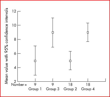Groupes 2 et 4 : 18 participants dans chaque groupe ; mêmes valeurs moyennes obtenues pour les participants pour le groupe 2 versus groupe 1 et pour le groupe 4 versus groupe 3 ; avec chaque fois 2 participants ayant les mêmes résultats qu’un participant des groupes 1 et 3 ; il n’y a plus de recouvrement des intervalles de confiance = différence statistiquement significative.